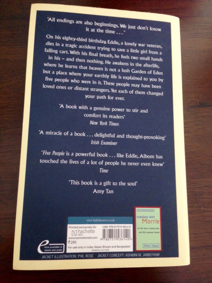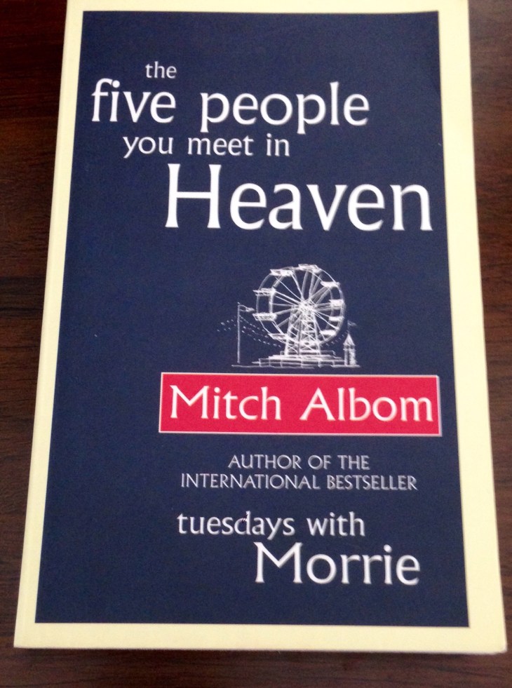 This book is an inspirational and philosophical fiction.The book is about an old Man named Eddie,who dies in a tragic accident trying to save a little girl from being killed by an amusement park ride that is about to fall.He is killed and sent to heaven.There Eddie meets five people who significantly impacted him while he was alive.