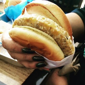 Anita tried the Buffalo chicken burger and chicken tenders and I had the Veggie burger. We also had the fancy fries, Caesar salad, Cookies and Milkshake.