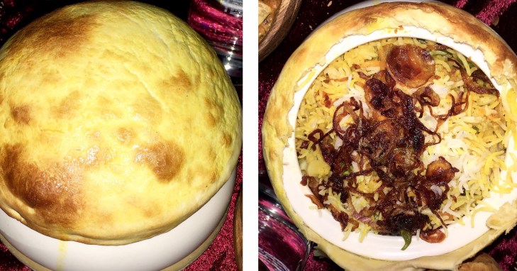 Next to make a Royal entry on our table was Dum turshi subz biryani or the vegetable biryani with burrani raita. The vegetable biryani was made with basmati rice, vegetables and spices cooked in dum style and comes in a sealed Handi with dried fruits. The biryani was bursting with flavors. The taste, flavor and aroma was excellent.