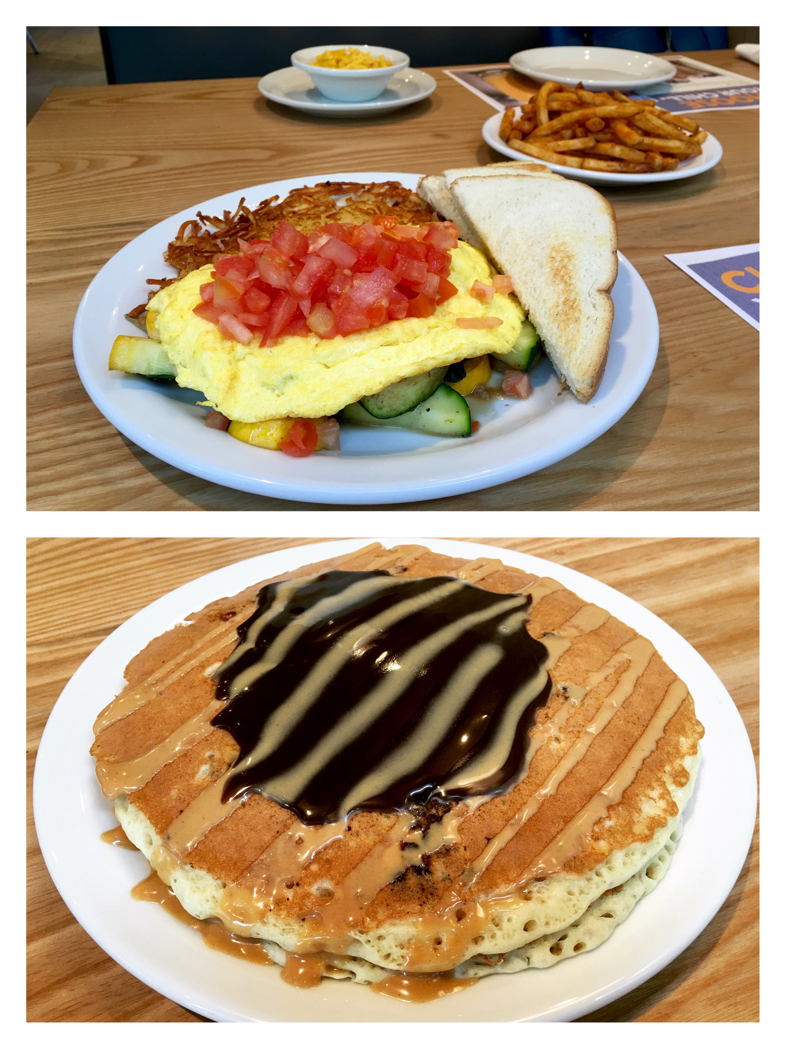 We ordered Loaded Veggie Omelette with Sourdough bread and Hash browns, Peanut Buttercup Pancake as our breakfast. We also ordered French Fries and Mac ‘n’ Cheese as our sides.