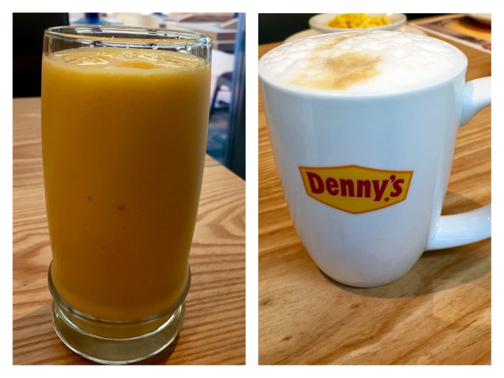 My friend and I visited Denny’s for a late breakfast last week. We started off with drinks first. I had a Groovy Mango Smoothie and my friend had a Cappuccino.