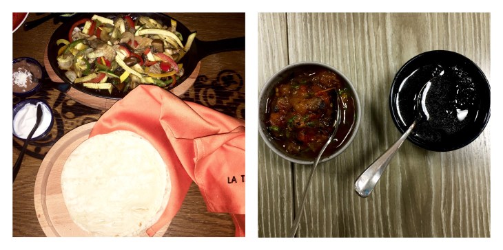 Fajita- Sautéed and grilled veggies that were crisp and crunchy came in a pan along with soft warm flour tortillas in a wooden box. I had it with the sour cream, refried beans and guacamole. It was a wholesome meal. I liked the zesty flavor in the veggies.