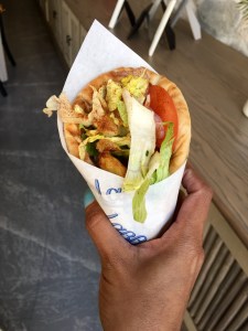 Gyros was served with grilled pita bread rolled up with tomatoes,hand-cut fried potatoes, onions, lettuce and Tzatziki. It was delicious. As I am a vegetarian, I asked them not to add chicken.
