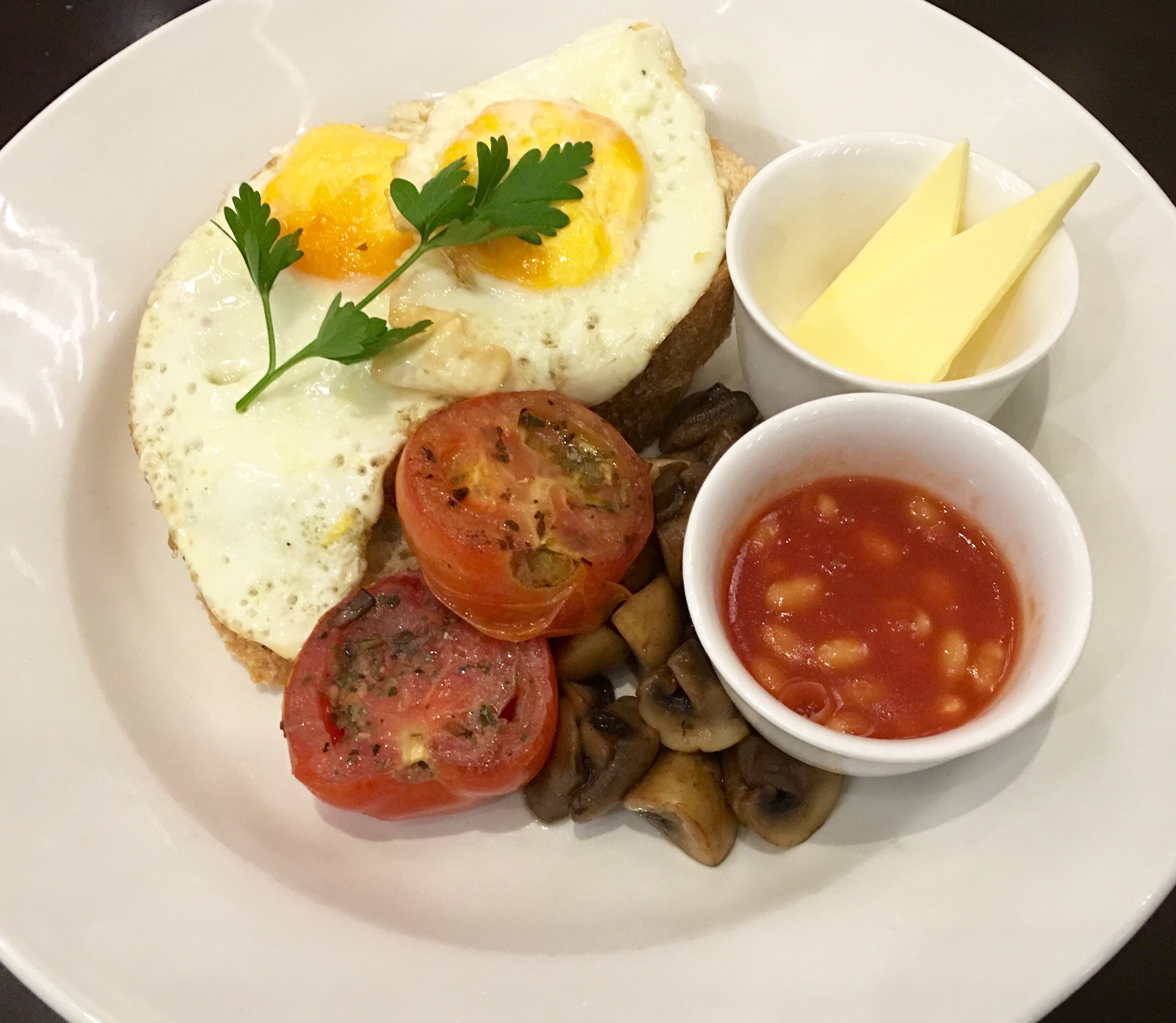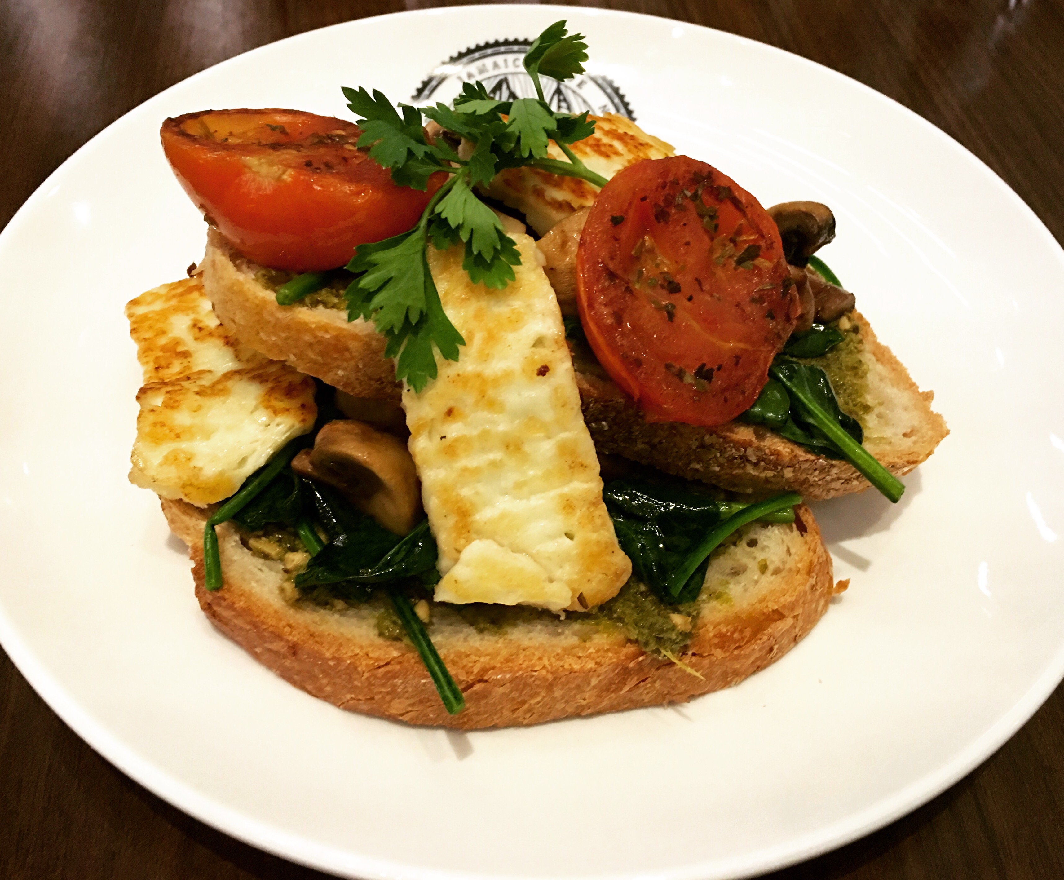 Vegetarian Breakfast is an open toasted sandwich with grilled halloumi cheese,roasted tomato, mushrooms and pesto on toast. It was a bit bland for our taste buds.
