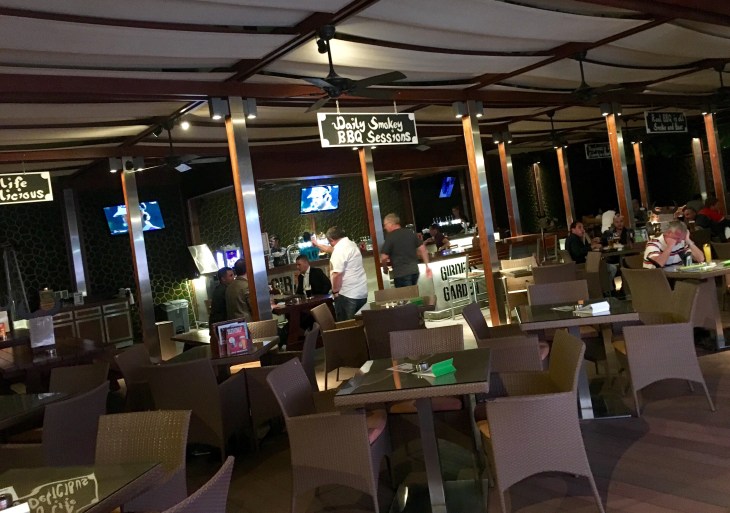 Girders Garden has outdoor seating. It is a casual dining spot. It has a relaxed and friendly vibe. It has comfortable cane and wooden seating and dim lighting. Great music adds to the lively atmosphere of the place. It is a good place to catch live sports action on the big screen. They have a well stocked bar.