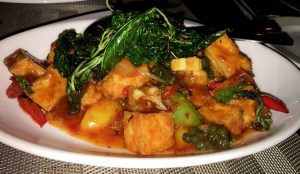 Tofu Curry was made with tofu and other veggies in red sauce. It had well balanced flavors.