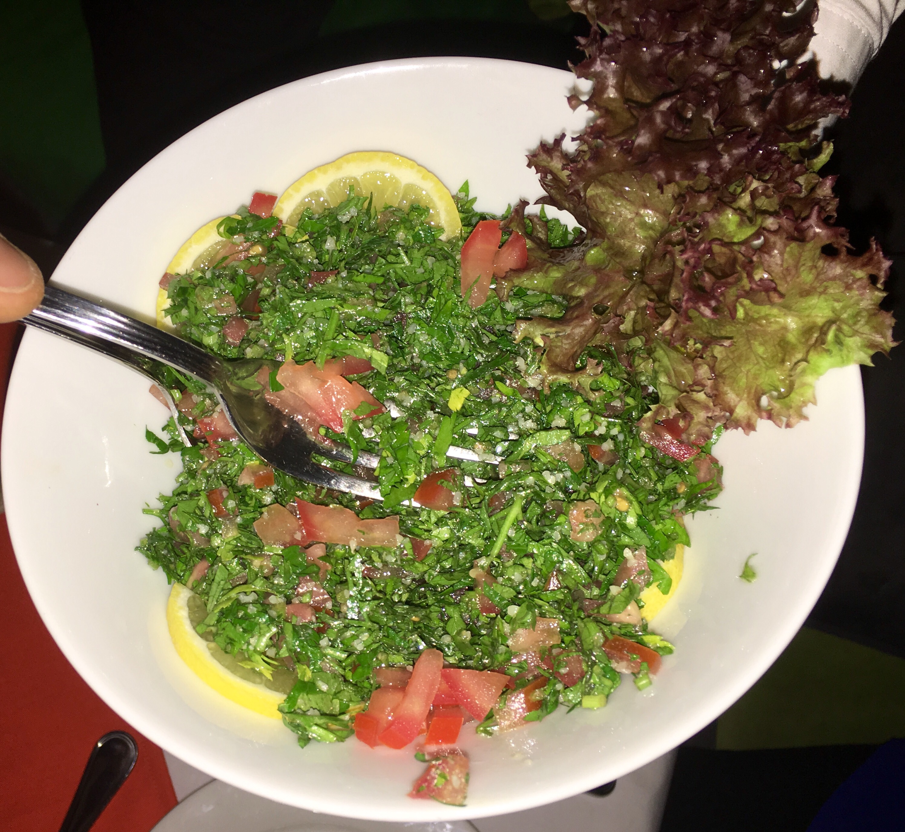 Next we tried Arabic cuisine and this was our favorite. We ordered Tabbouleh, Hummus and Hummus B’Lahme. We were also served complimentary Arabic bread.