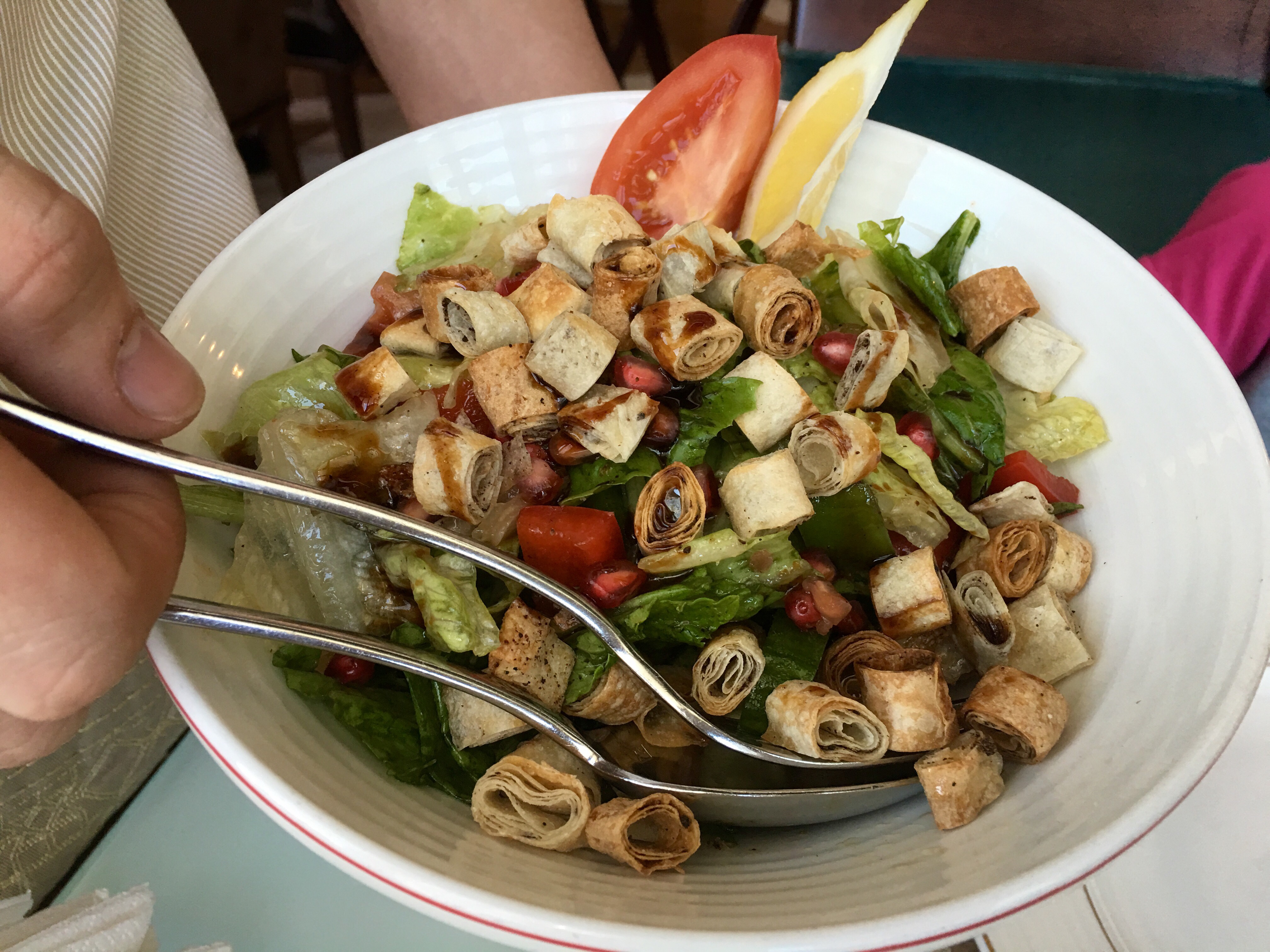 Fattoush was made fresh with seasonal veggies and mixed with watercress, baby lettuce, sumac and lemon dressing with crispy saj bread rolls.