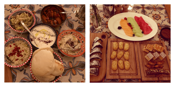 As a vegetarian I tried only the vegetarian dishes. Some of my favorites were the couscous salad, falafel, fried halloumi cheese, Mohammara, moutabel, fragrant saffron rice, Moroccan Tagine and freshly baked Arabic bread.