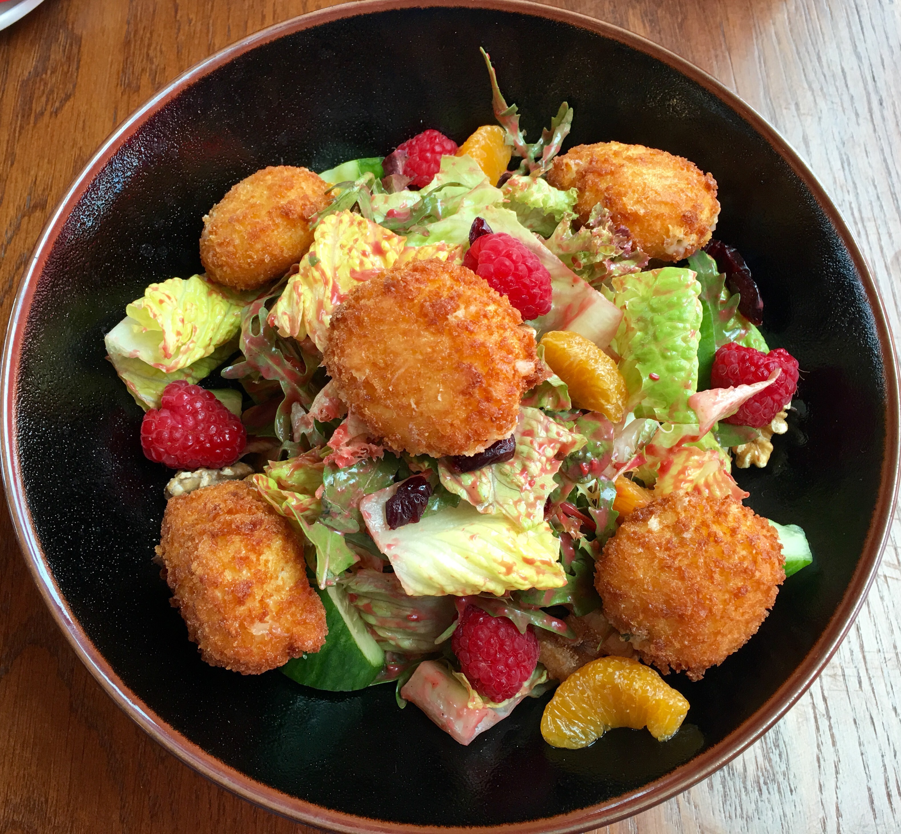 Fried Goat Cheese Salad-We started off with the delicious and nutritious fried goat cheese salad. It had fried goat cheese, mixed greens, cucumber, orange wedges, raspberries, walnuts with raspberry vinaigrette.