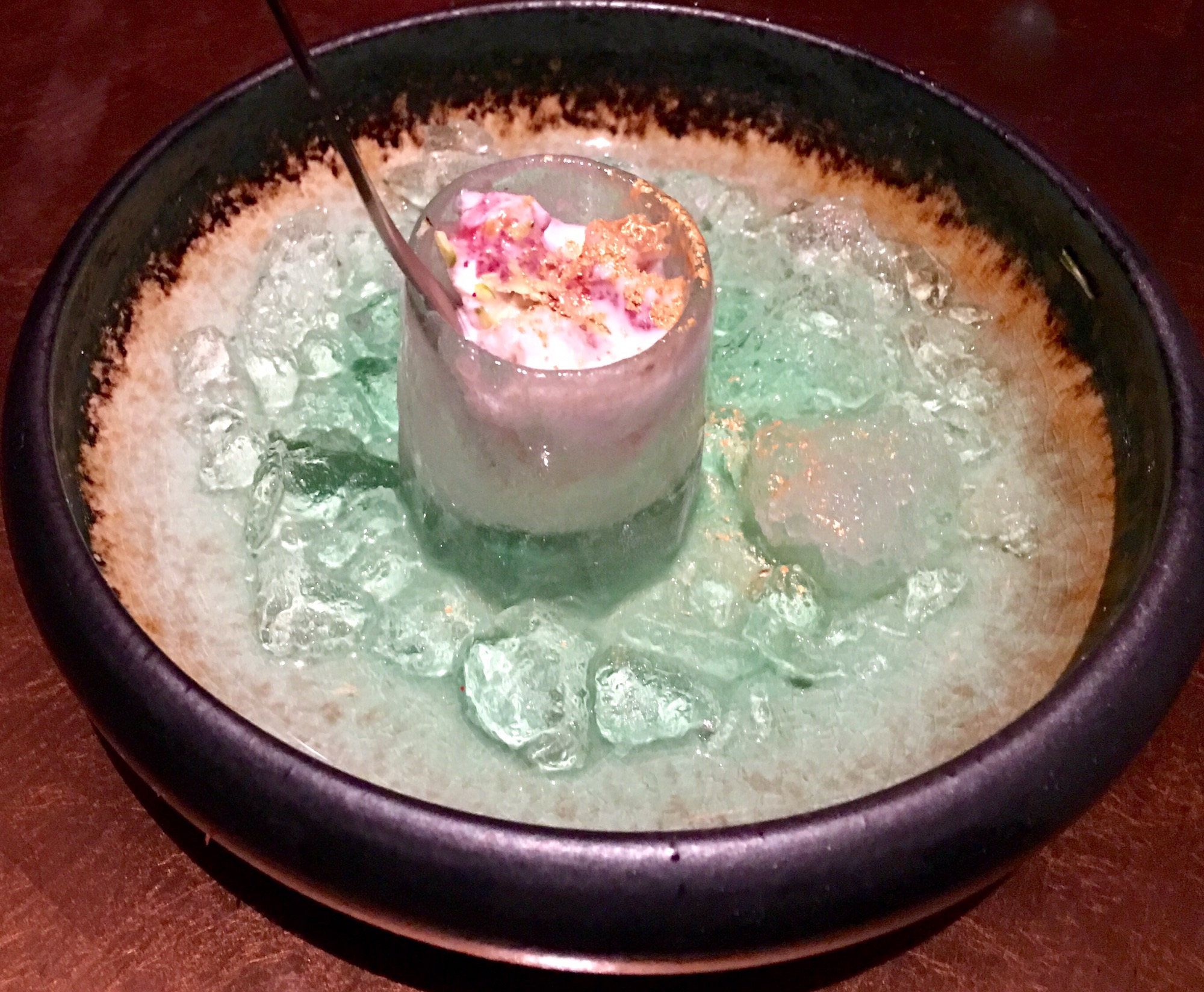 Malai Baraf was a creative take on the humble malai barfi. It was a litchi granita infused with raspberry and rose water. It was served in a glass made of ice. It was deliciously refreshing.