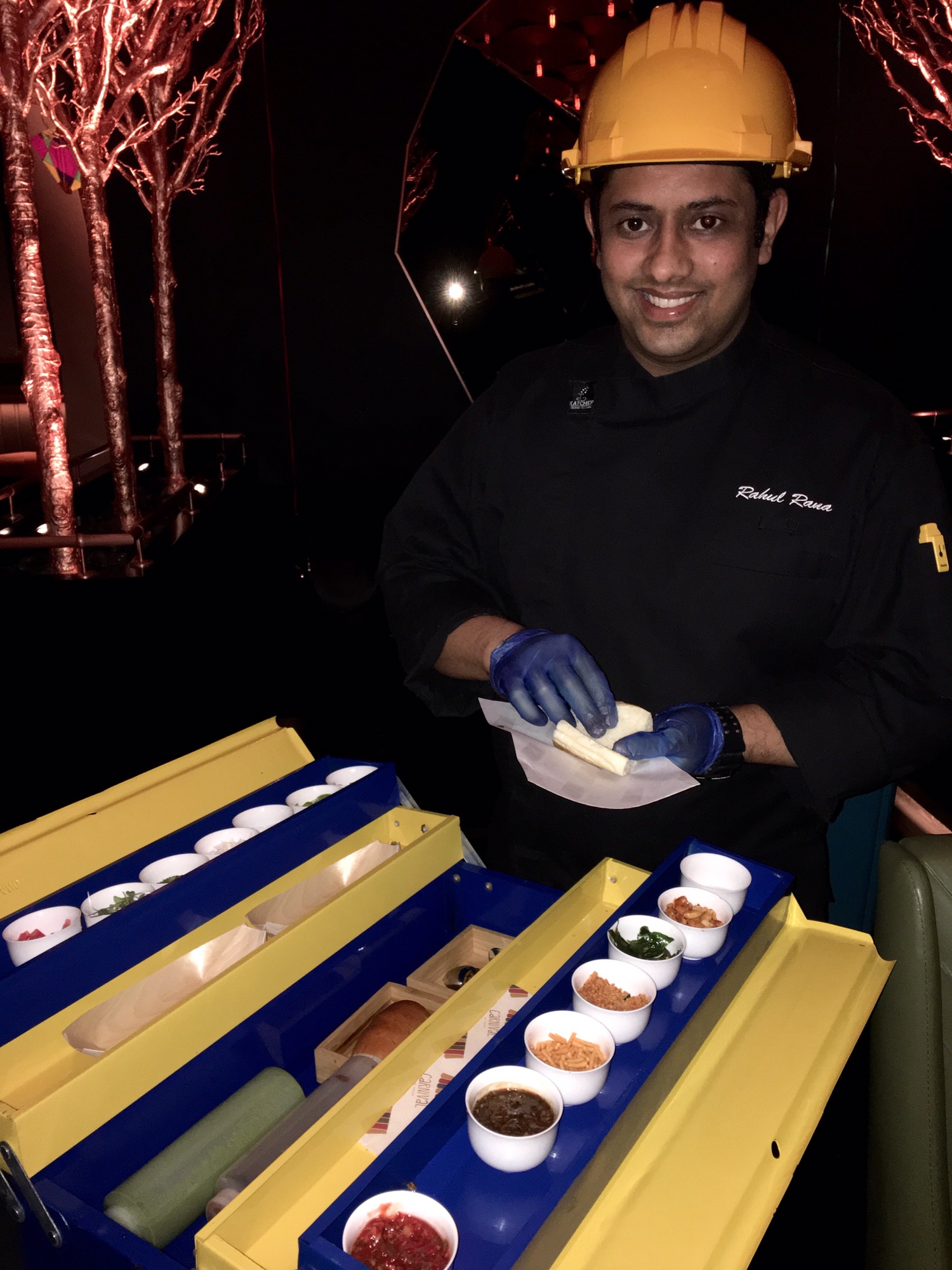 Vada Pav Service is the popular Indian streetfood Vada Pav. But in Carnival be ready for an unique interpretation of this ever popular dish where they pay homage to Mumbai mill workers. This dish was made right in front of us by chef Rahul wearing a mill worker uniform and helmet. The ingredients came in a tool box and he used many different spices to make it. The Vada Pav was outstanding, I am sure even the hardcore of meat eaters will love this.