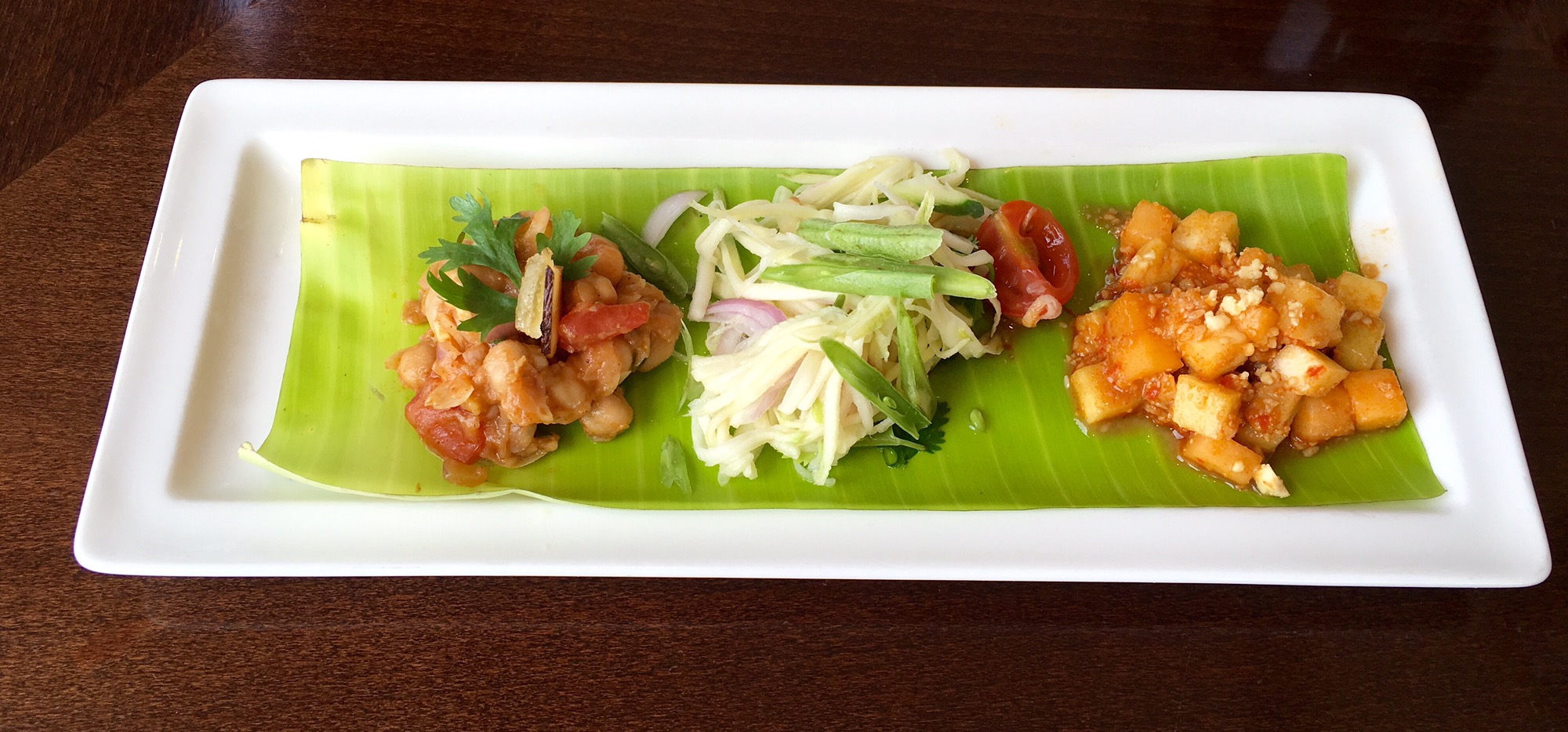 Salad Sampler was the first course. It consisted of Green Mango and long bean salad, Malay Rojak salad and Chana chaat. Thai, Malaysian and Indian salads respectively. Each of them had one thing in common-they were packed with flavor. The portion size was perfect.