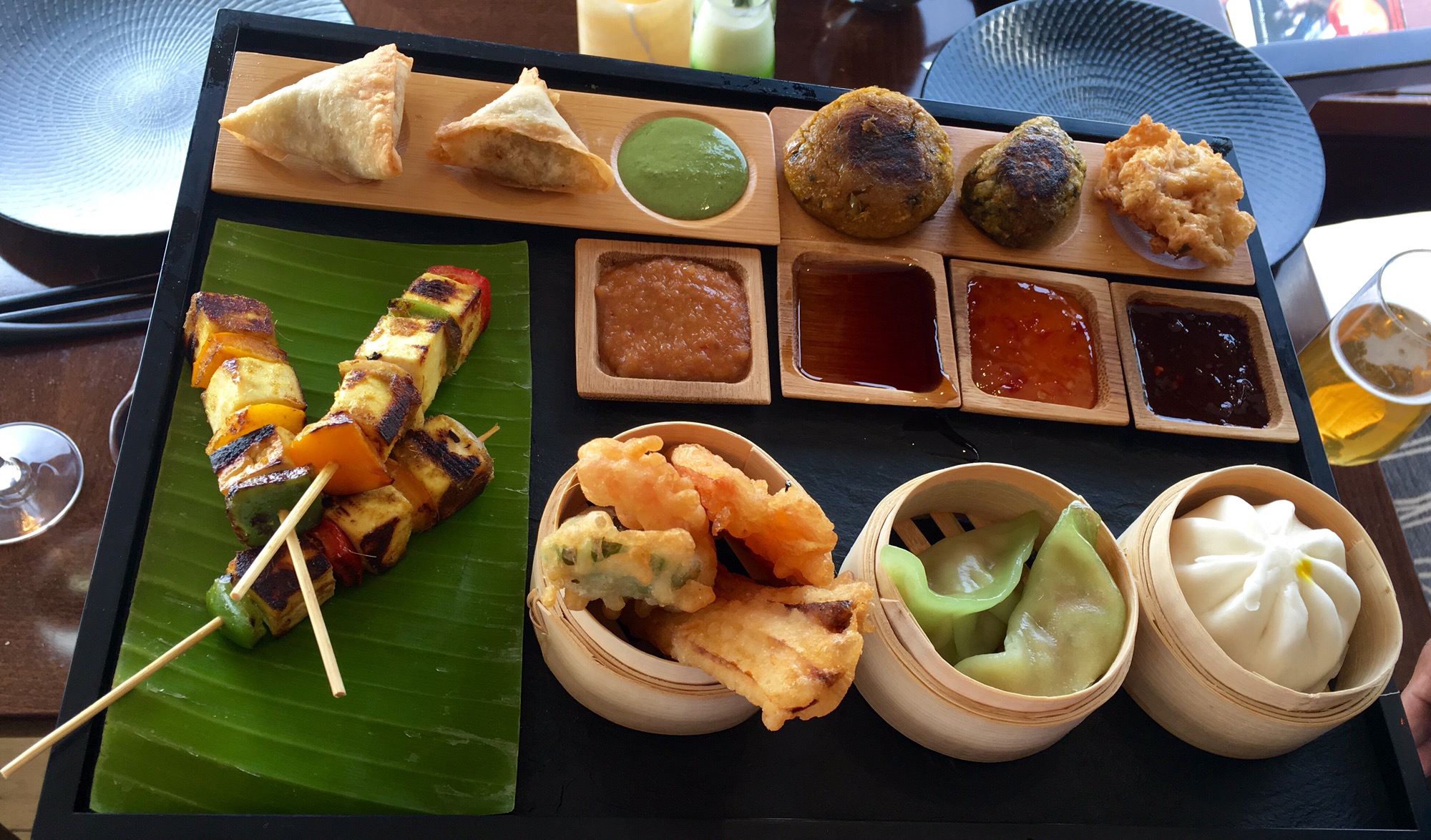The Hot Appetizers arrived next. The selection that we were offered were amazing. There was Golden Taro cake, Chinese Vegetable dumplings, Japanese Veg Tempura, Paneer Satay, Indian Samosas and Shammi Koftas. The platter was presented beautifully. I can’t find fault with any one of the hot appetizers. It was fantastic.