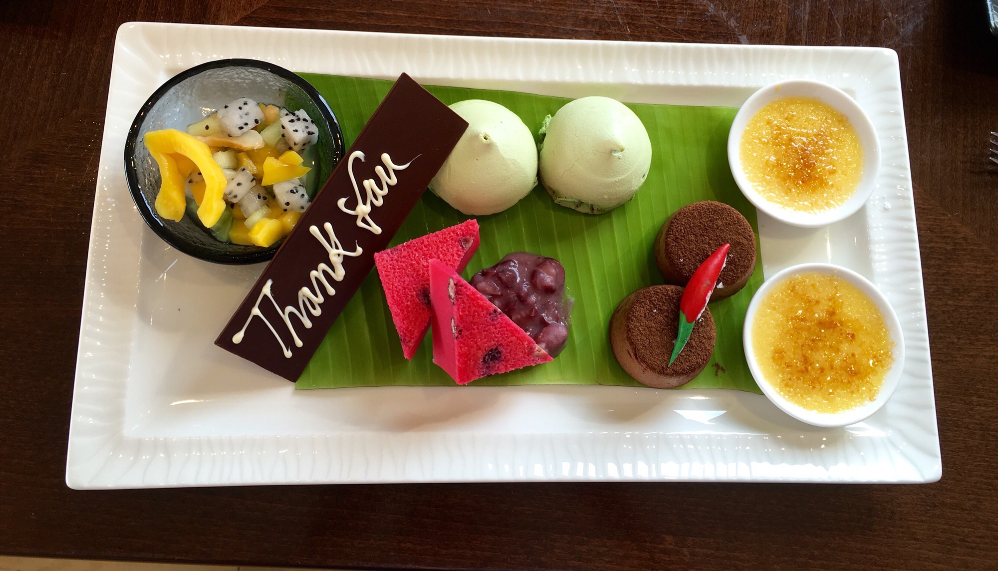 The last and the most awaited course was the Dessert selection. And what a delicious selection it was-Asian Crème brûlée, Exotic fresh fruits, Red bean steamed cake, Pandan meringue and Chilli chocolate cake. Each and every dessert was unique and tasty in their own way.