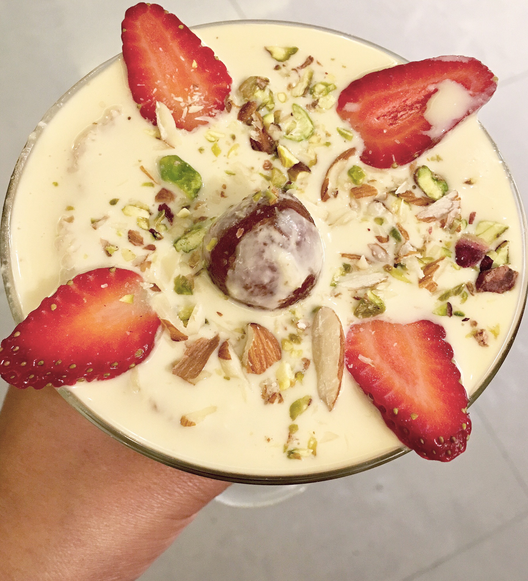 Zauk E Shahi is a dessert lover’s delight. This gorgeous looking dessert was packed with great taste and flavor. Served in a large cocktail glass, it had mini Gulab Jamun with Rabdi and crispy sweetened bread and was garnished with bits of pistachios and thinly sliced strawberries. It can be easily shared between two people.