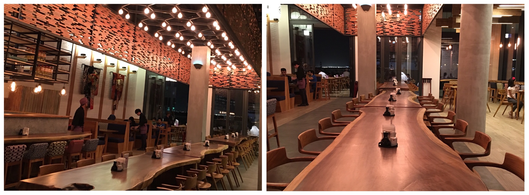 The Japanese inspired decor is elegant and minimalistic. The wooden furniture, authentic Japanese tableware and colorful kimonos adorning the walls of the restaurants enhances the dining experience. The restaurant is spacious and also offers an outdoor dining area with a good view.