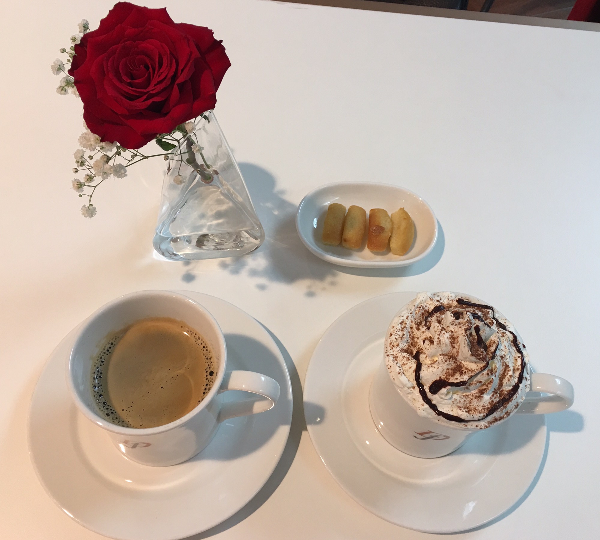 Délifrance has a cosy atmosphere. The trendy red and deep blue interiors gives it an elegant and classy Parisian touch. Vase with bright red rose in every table adds a romantic flair to the place.